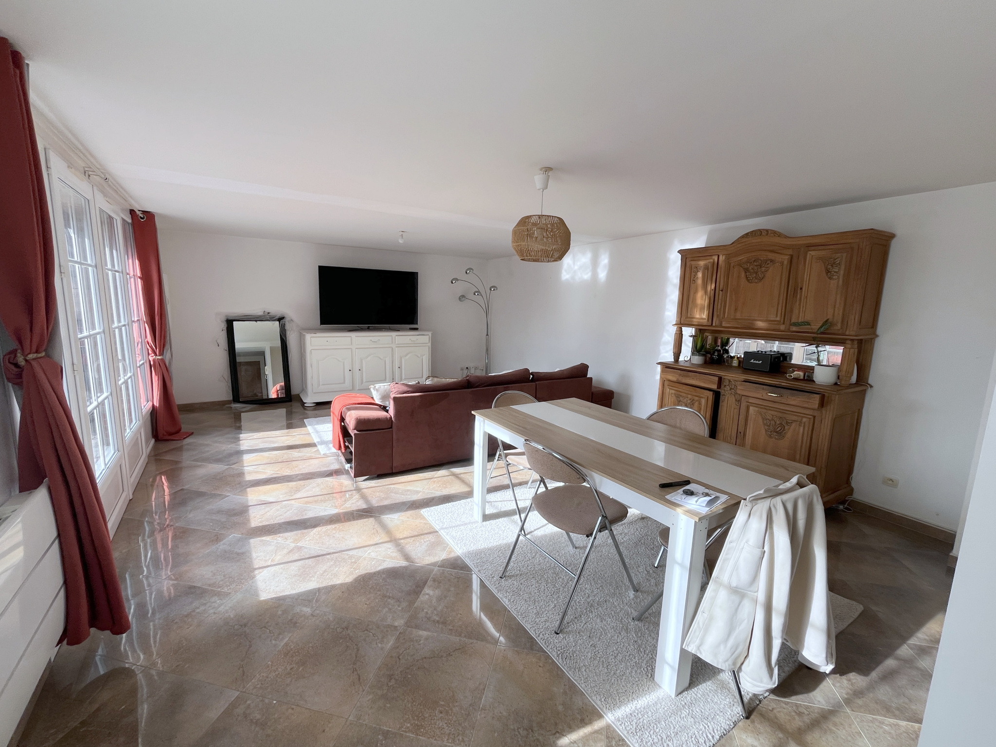ABONDANT - MAISON mitoyenne de 91.05m² habitables avec terrasse privative, comprenant au rez-de-chaussée un séjour de 31 m², cuisine aménagée et équipée, salle de bains avec baignoire, douche et WC. A l'étage : un palier desservant deux belles chambres, une salle de douche et WC séparés. Cave, Grand garage, courette privative. Chauffage electrique CLASSE ENERGIE : D et CLASSE CLIMAT : B - Montant estimé des dépenses annuelles d'énergies pour un usage standard de 1190€ à 1660€, année de référence 2021" Loyer mensuel charges comprises : 935€ (dont provision sur charges avec régularisation annuelle de 35€ pour la taxe ordures ménagères et l'eau froide). Dépôt de garantie : 900€. Honoraires à la charge du locataire : 900€ euros (dont 273.05€ pour l'état des lieux)