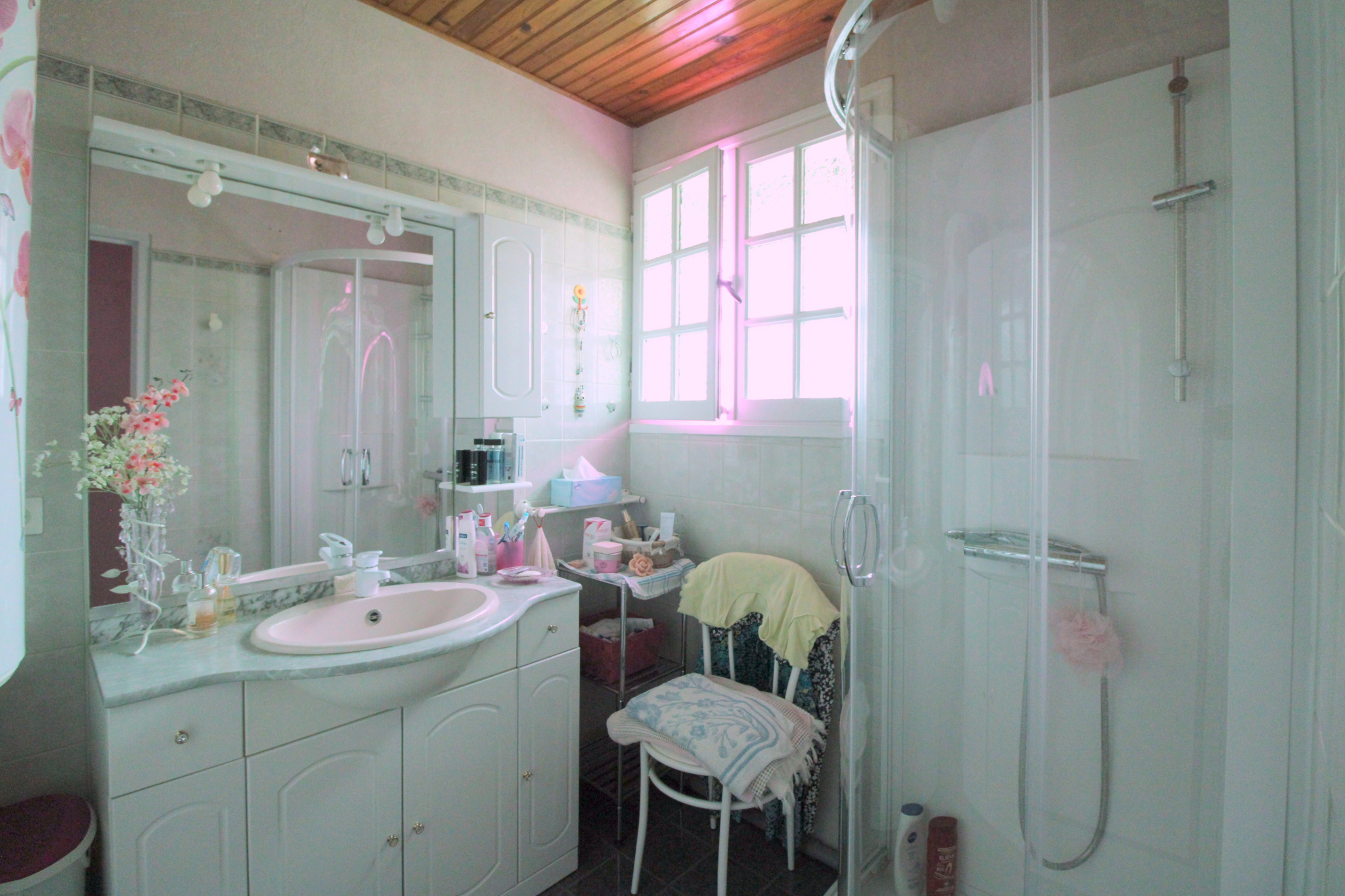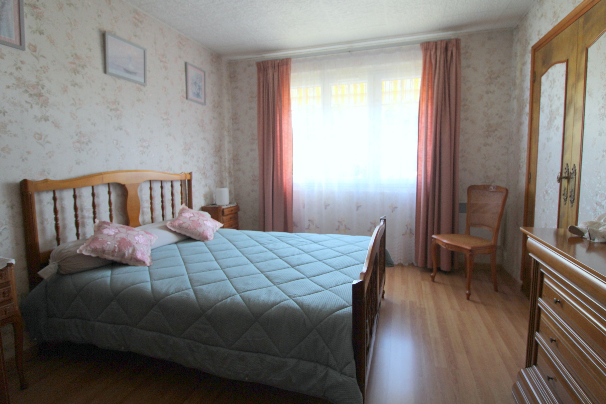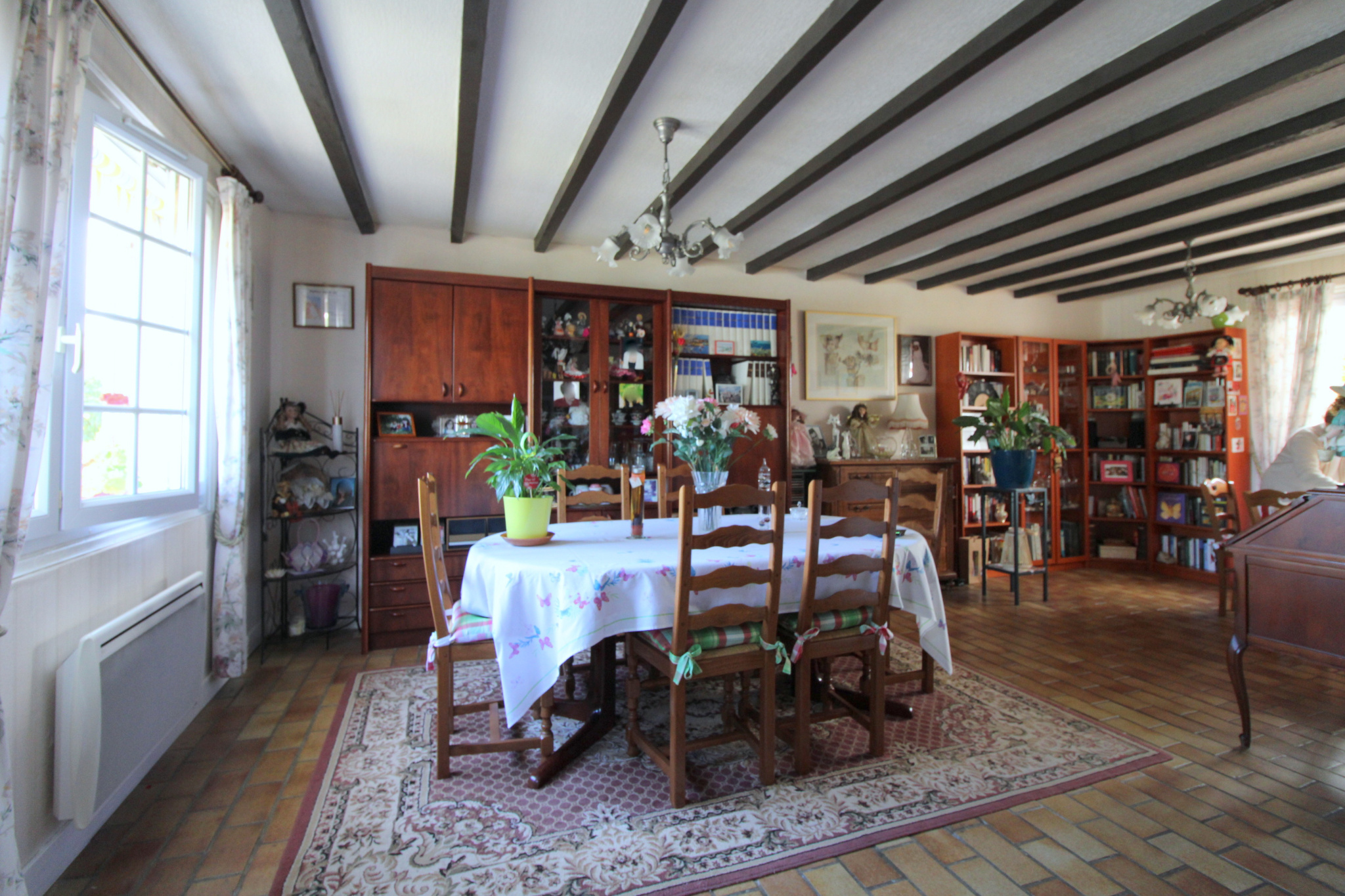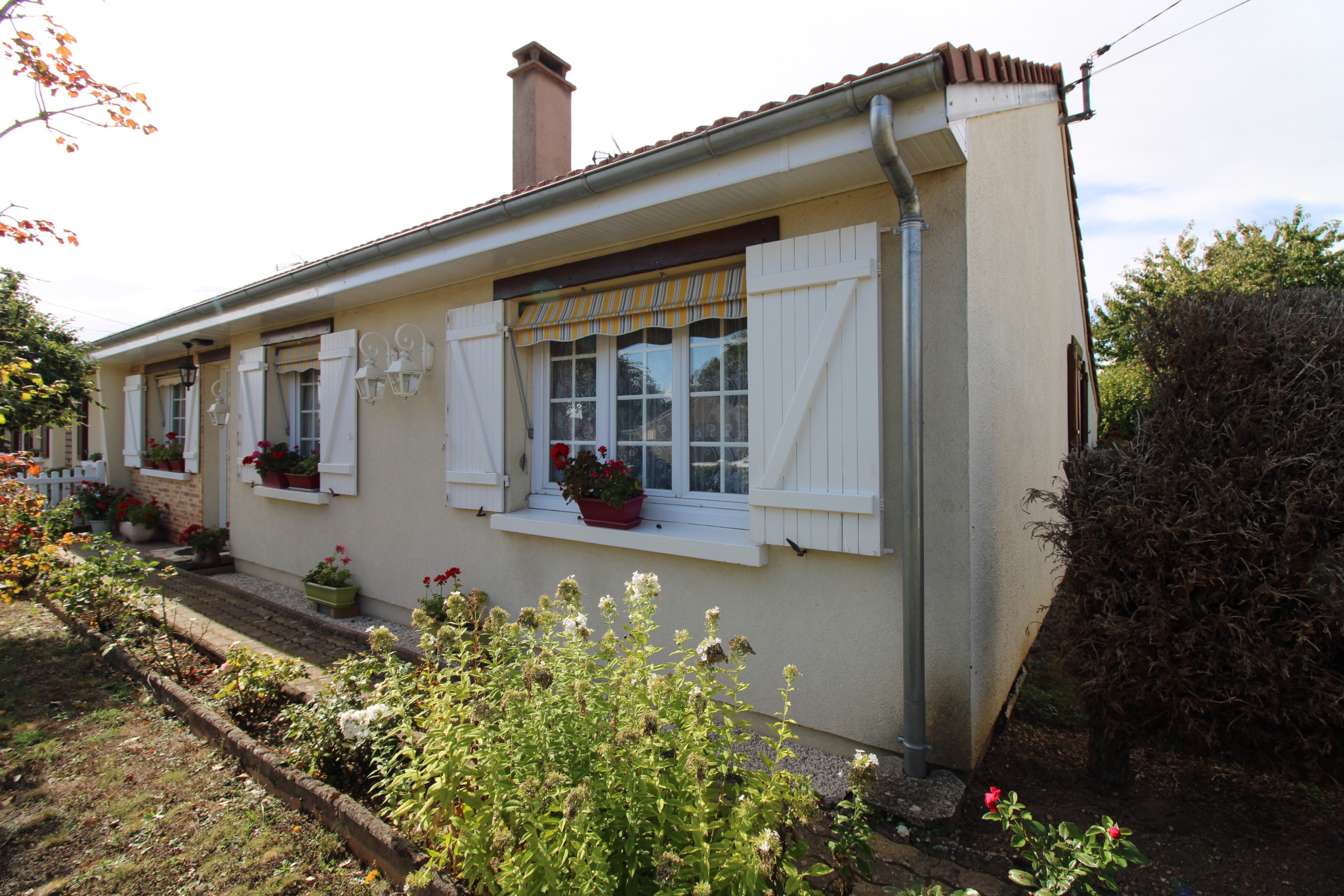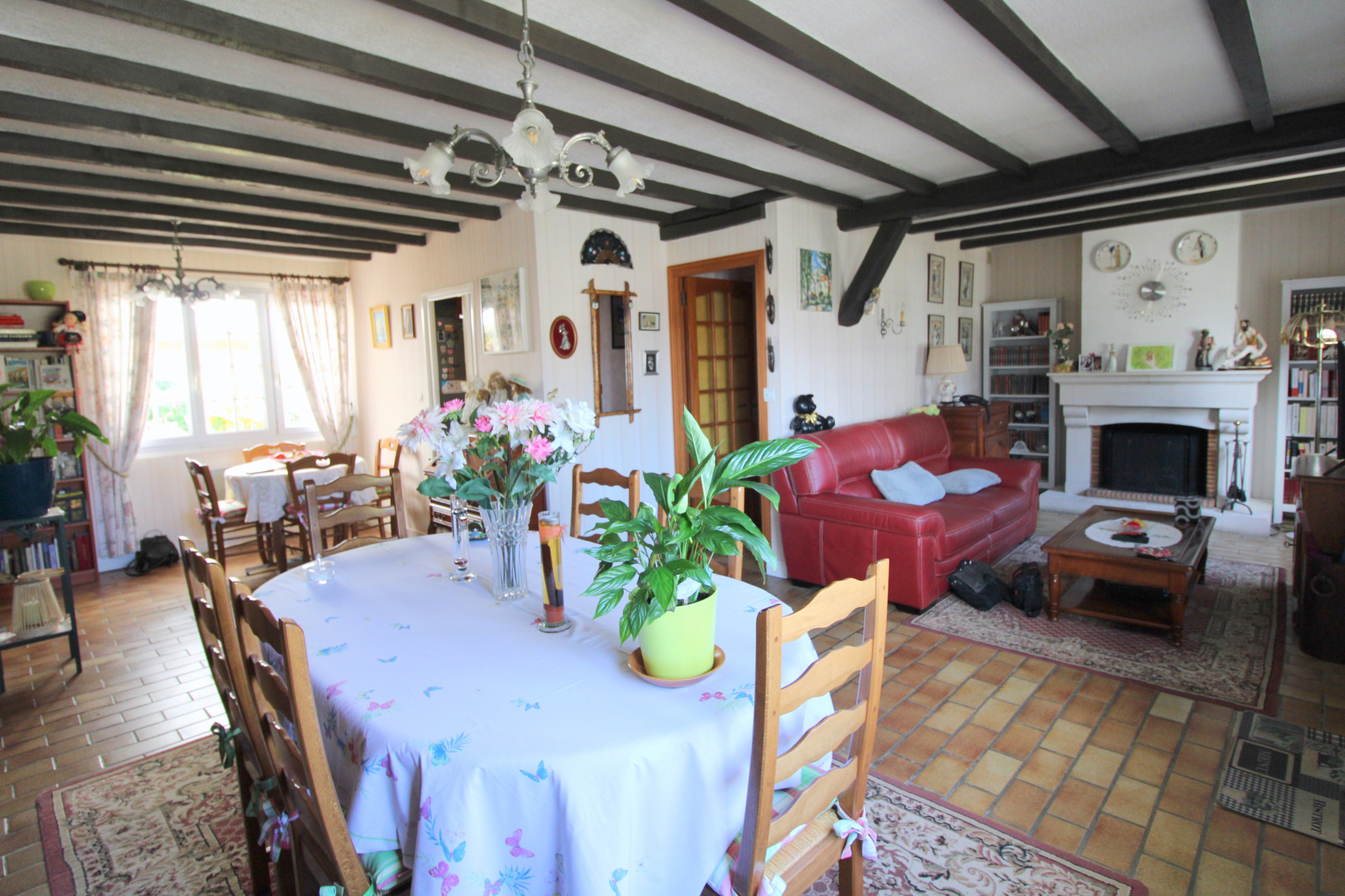 Dans copropriété de Maison de plain-pied très bien entretenue comprenant : grand séjour-salon avec cheminée de 37m² env. cuisine aménagée, 3 chambres dont une avec placard, salle d'eau, wc.