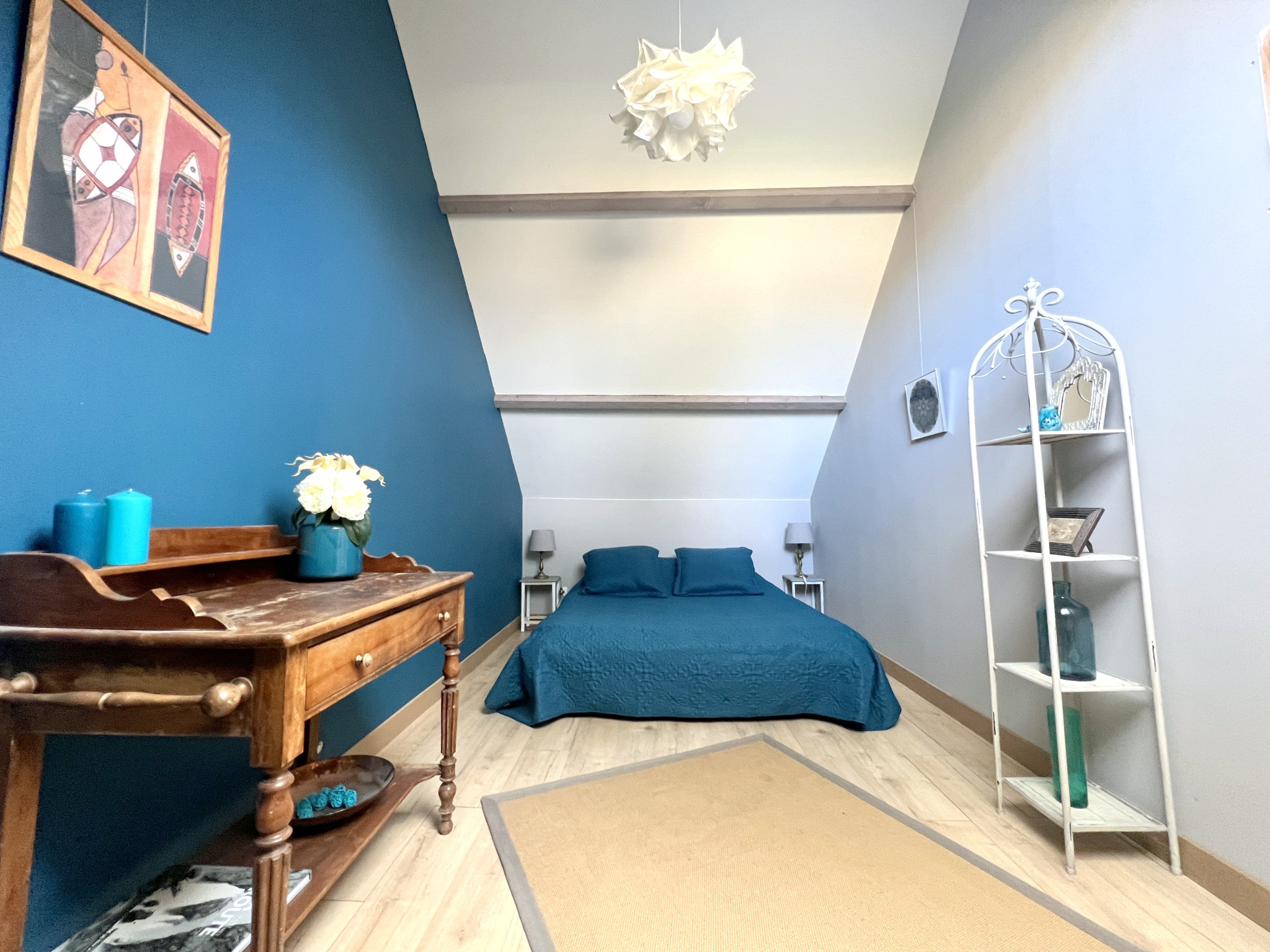 À l’étage, le charme continue d’opérer : un palier distribue quatre chambres, refuges calmes et lumineux, ainsi qu’un atelier propice à la création.